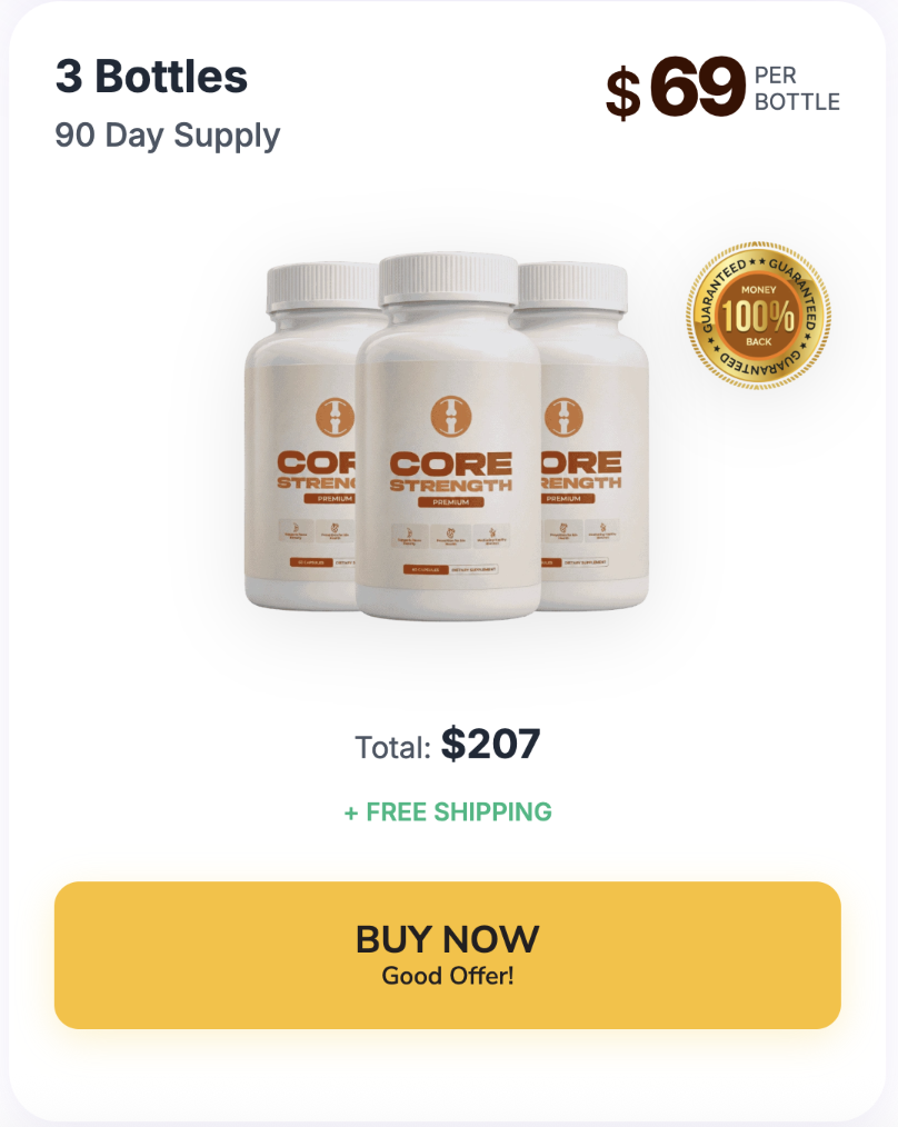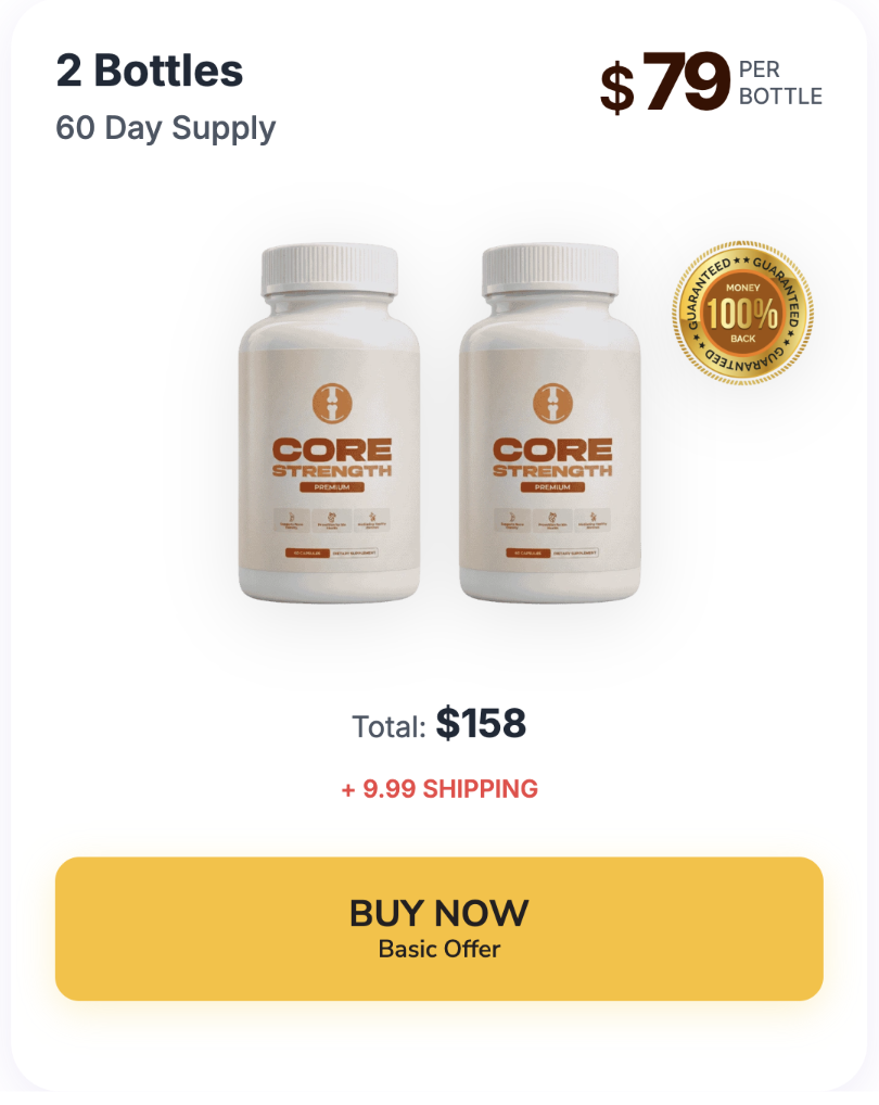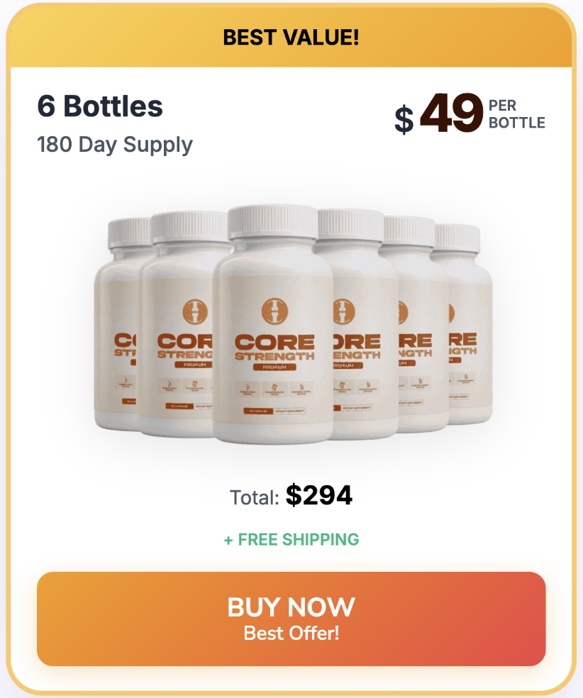 CoreStrength is a powerful, natural formula engineered to silence chronic inflammation, rebuild damaged joints, and restore pain-free movement as your body ages. Many adults struggle with relentless joint pain, morning stiffness, and progressive loss of mobility that makes even the simplest daily activities feel impossible. CoreStrength is designed to fight back. By delivering targeted anti-inflammatory nutrients and potent botanicals directly at the cellular level, CoreStrength helps neutralize the inflammation destroying your joints, accelerate cartilage regeneration, and restore your natural range of motion — attacking the root causes that block healing and steal your independence. The result is a body that feels freer, stronger, and more capable — day after day. Adults across the USA report feeling noticeably less pain, moving more freely, and finally back in control of their bodies and confidence. CoreStrength delivers a decisive, science-driven approach to joint health — helping you reclaim movement, consistency, and long-term wellness, naturally.